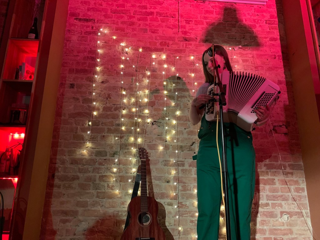 Anna Pancenko comes on, spring in her steps. She juggles between guitar, accordion and harmonica. A deluge of genres – indie, folk, blues – is backed by quirky details from misbegotten adventures.